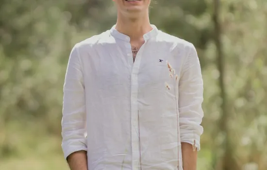 Trinity tutor Luke Rostill sits smiling in a tutorial.
