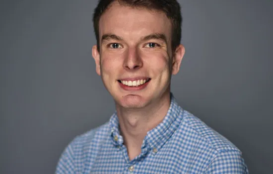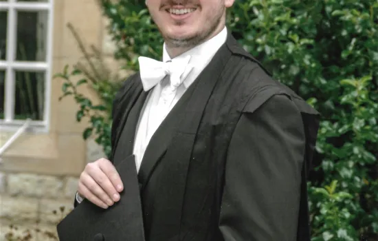 Trinity tutor Luke Rostill sits smiling in a tutorial.